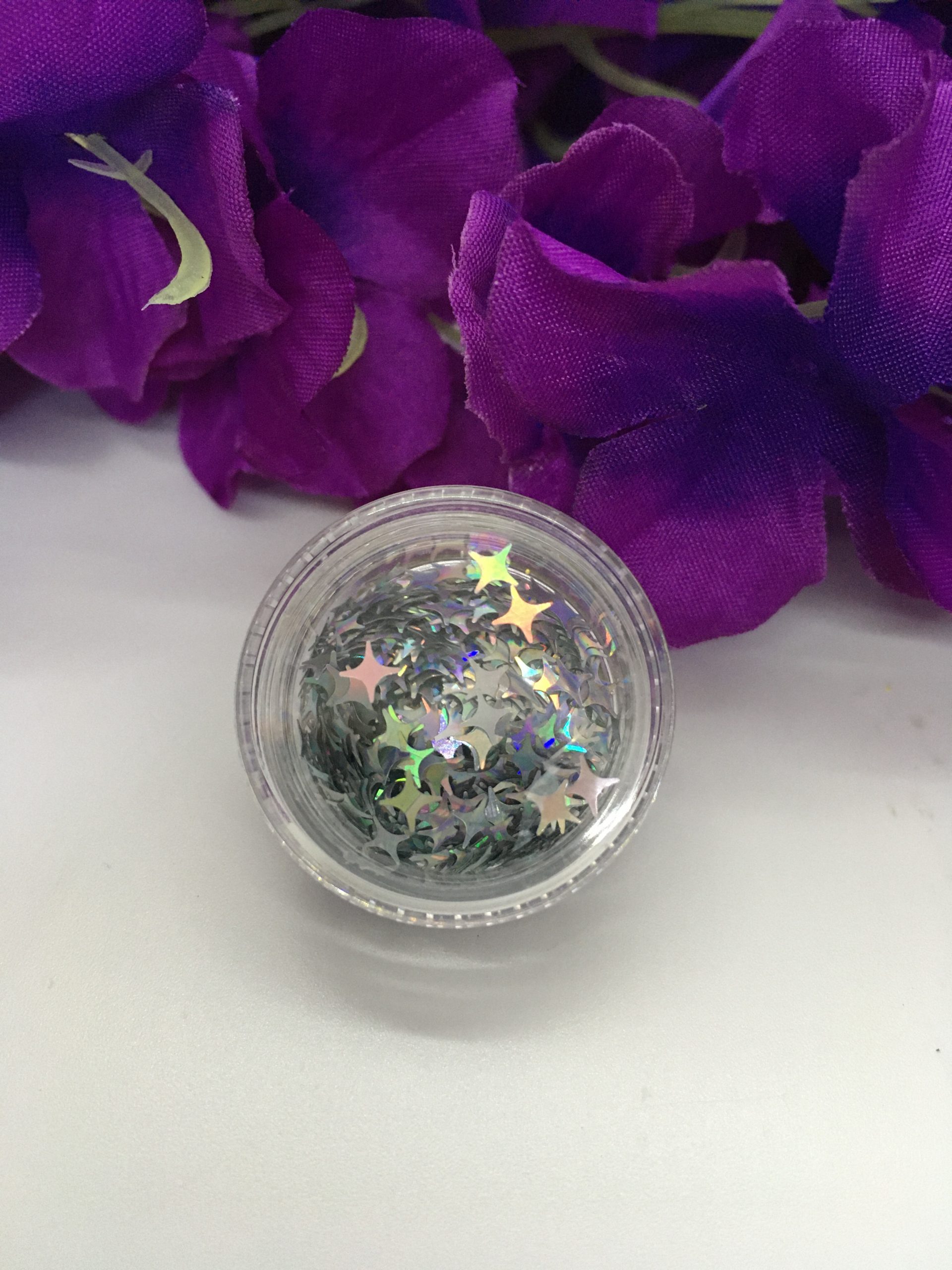 Star nail art holographic Can be used on nails, eyes, face and any part of the body as body glitter to give you more sparkling effects. And can be used as an decoration in phone cases, books, wallet, shoes, jewelry making, greeting cards, mirrors, DIY crafts, etc.