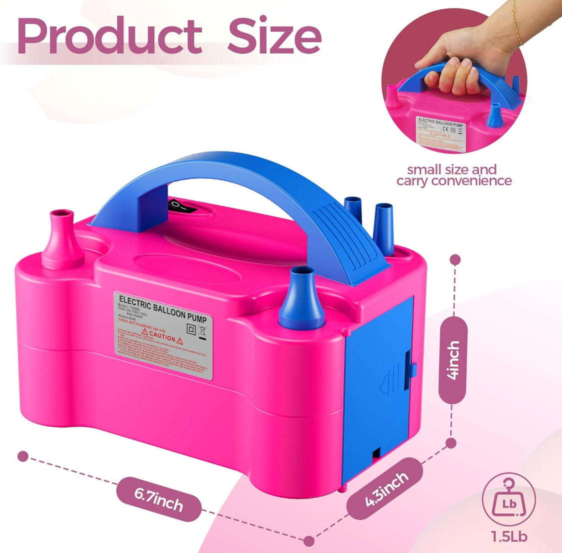 - Light Weight & Portable Design – With only 3lbs, this electric balloon Pump is super Compact! Size – 20 x 15 x 12 (cm). Air Pressure: 2.1 PSI, Airflow: 750L/min, Power: 600W. Put anti-sliding pads at the bottom and lower the noise(lower than 85dB).