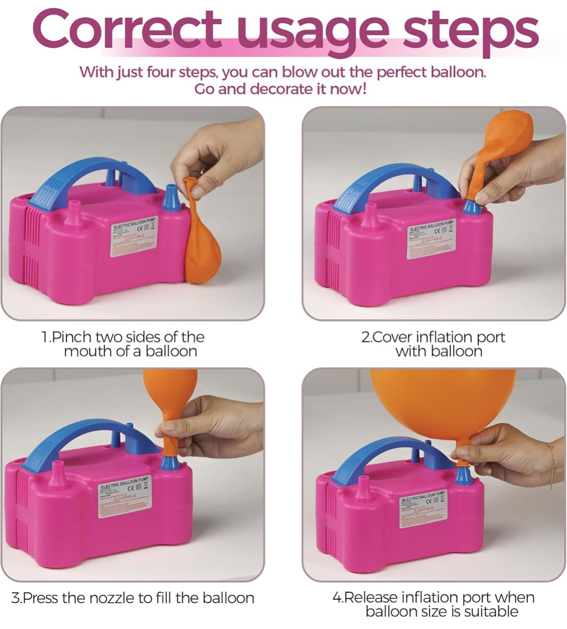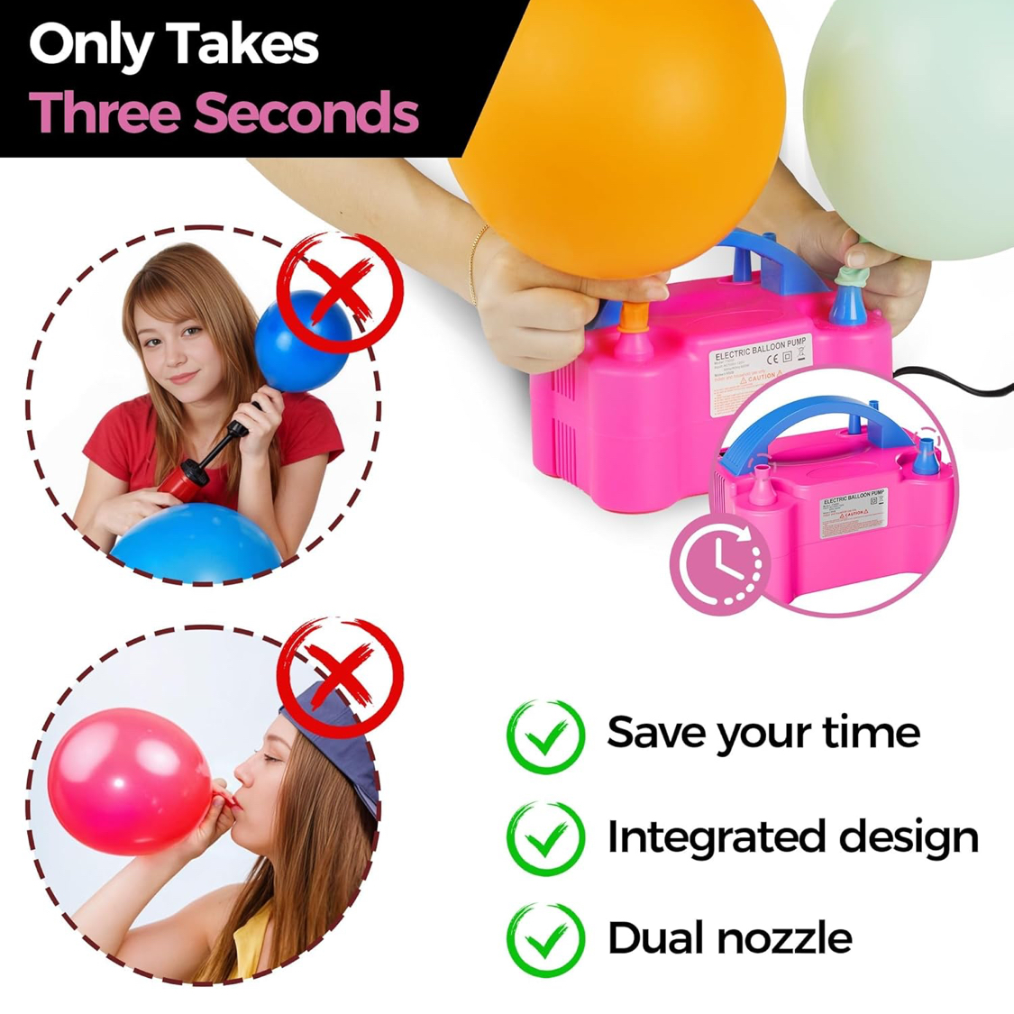 - Awesome Time Saver – Forget sore cheeks, dizziness, and gasping for air when blowing up all those party balloons! This quality electric air balloon pump will inflate hundreds of decorative latex balloons in super-fast time.