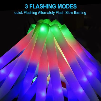 Light up foam sticks: Glow foam sticks Press the power button to switch between 3 different lighting modes, fast flash, slow flash and alternate flash. Choose your favorite mode to make the atmosphere more cheerful and happy