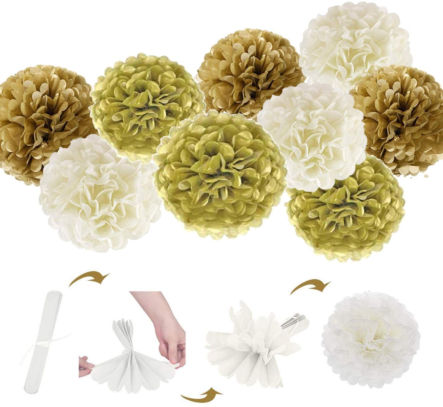 9 Pack Paper Poms in 3 size and 3 color. Feature: 6″, 8”, 10” Gold, Kaki, White – 1pcs of each color and size in total 9pcs