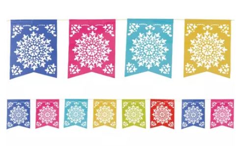 The Del Sol Flag Pennant Banner is a classic decoration for any south-of-the-border fiesta! Featuring die-cut flags with the traditional Mexican sun design, this colorful del sol banner can also be used to add festive flair to everyday decor. Made of glossy paper and attached to thick string, this decoration will last through your whole fiesta!