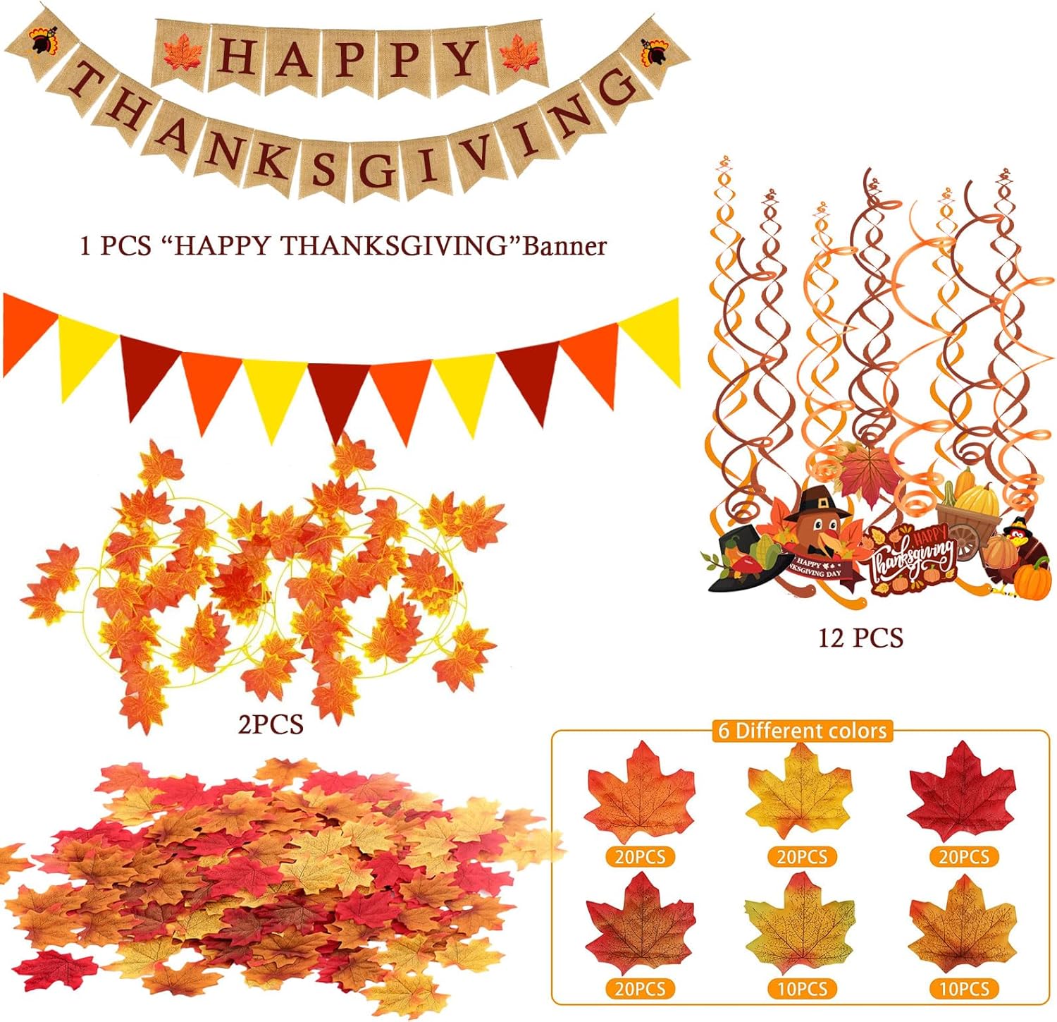 Package:1xHAPPY THANKSGIVING;1xTriangular Bunting banner; 2pcs Maple leaf Garland;12pcs swirls banners;6 different colors maple leaf.