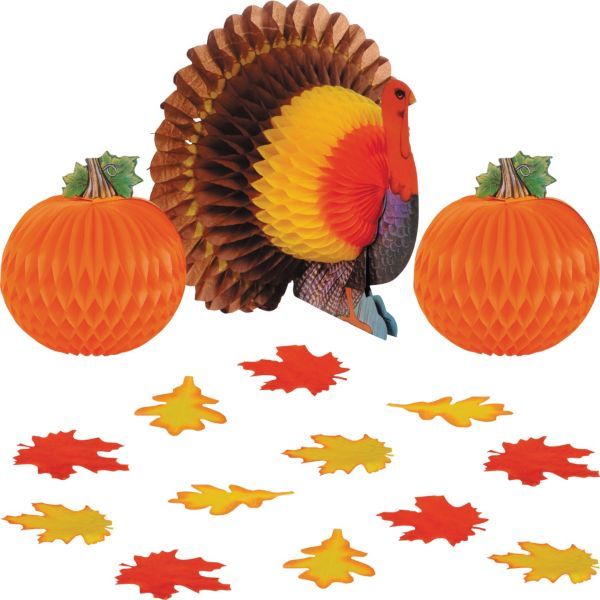 Add a touch of fall to every table and surface with this decorating kit. The Traditional Thanksgiving Table Decorating Kit consists of honeycomb decorations of turkey and pumpkins. Assorted leaves can be used to scatter on tables, bookshelves, or placed inside invitations.