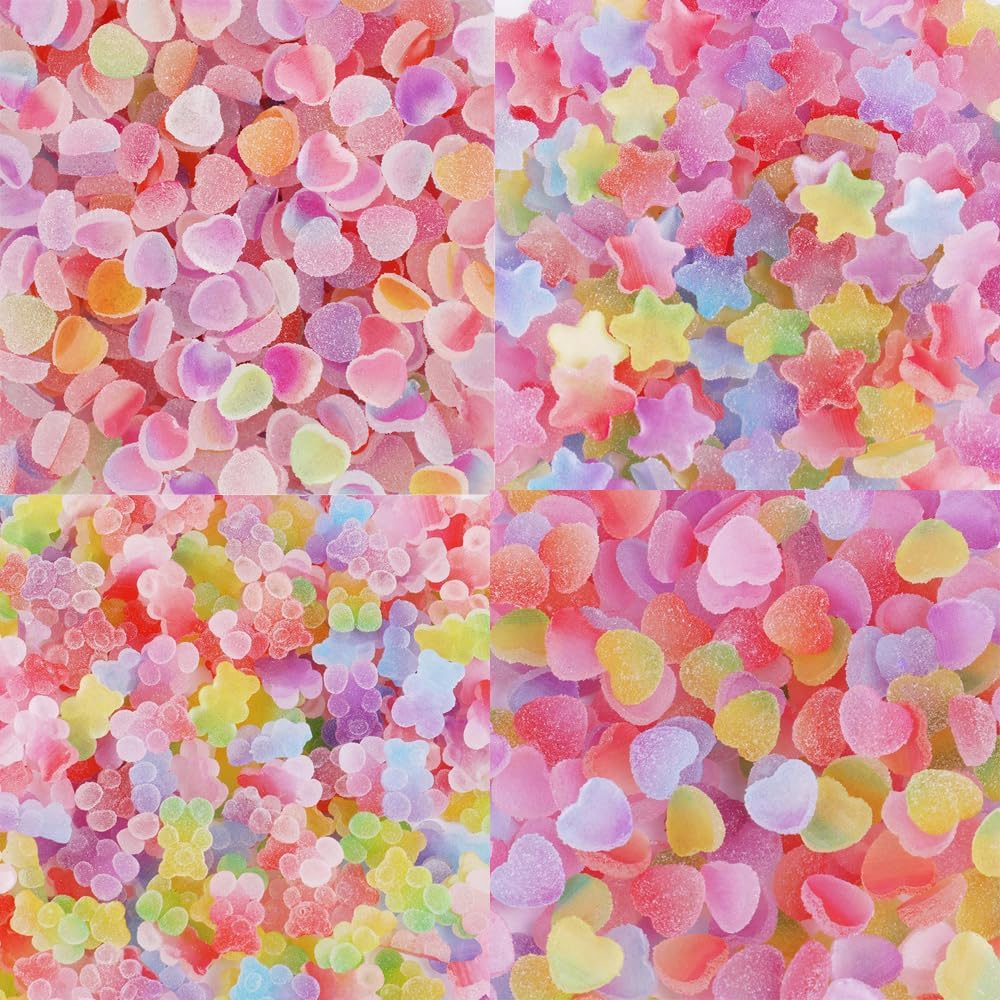Adorable Gummy Designs:Enhance your manicure with our cute 3D mixed color cartoon gummy bear, star, and heart nail charms. Available in pink, purple, blue, and green, these accessories add a fun and vibrant touch to your nail art.