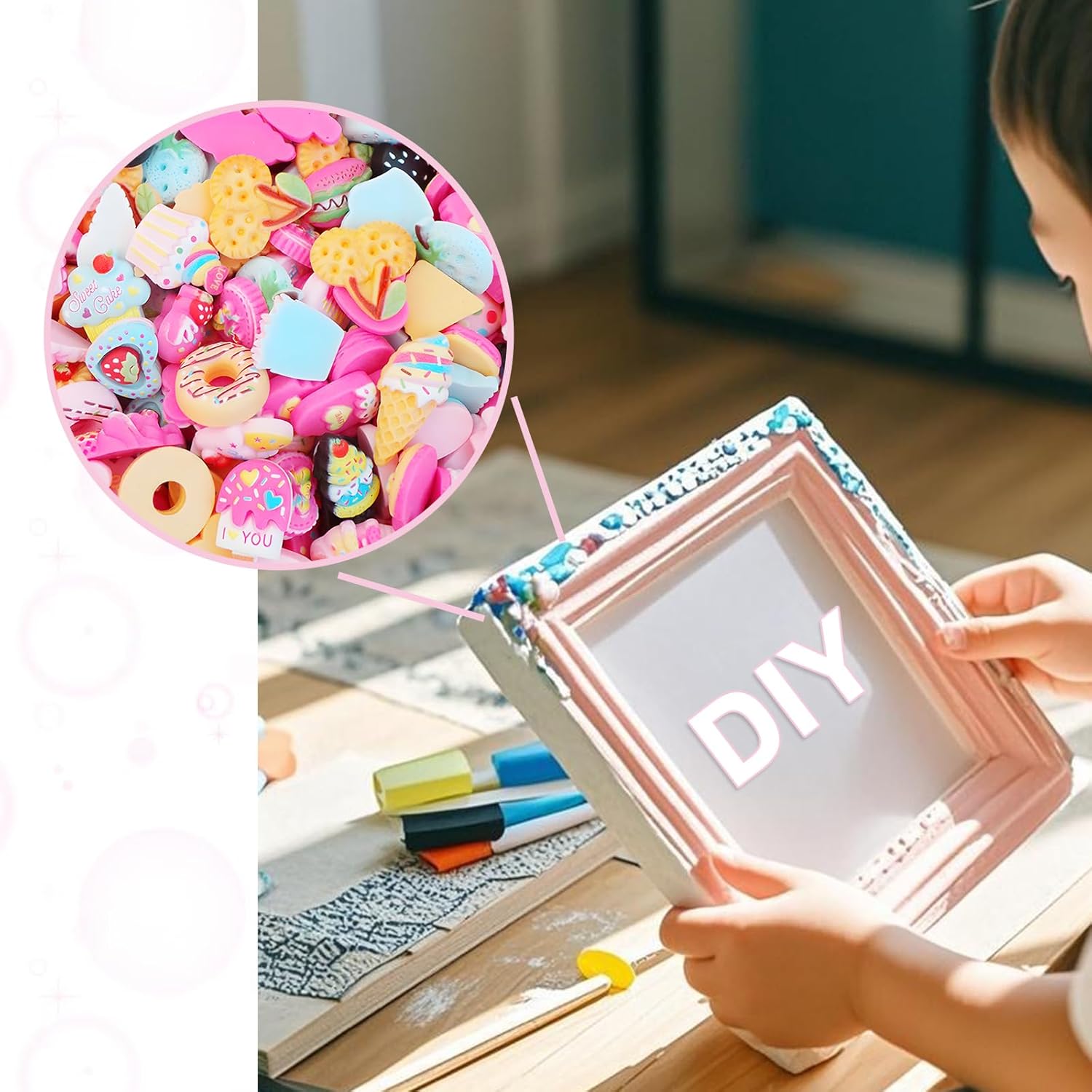 Package includes 50 flat-back resin ornaments in random, pink-themed styles including burgers, cookies, ice cream, donuts, cakes, candies, and more.